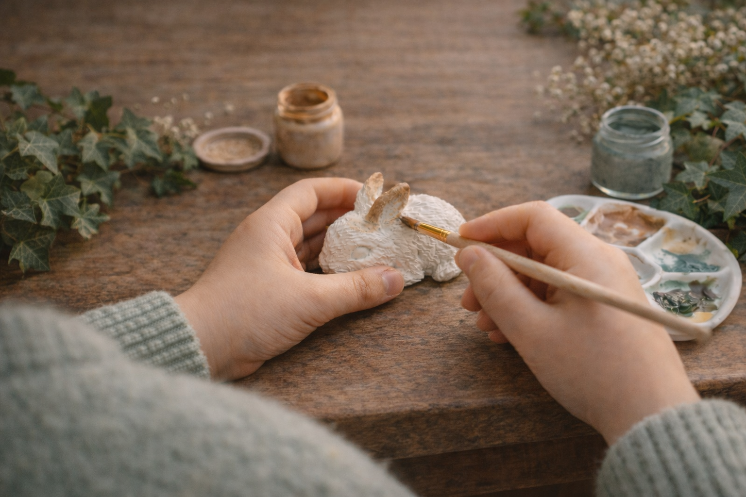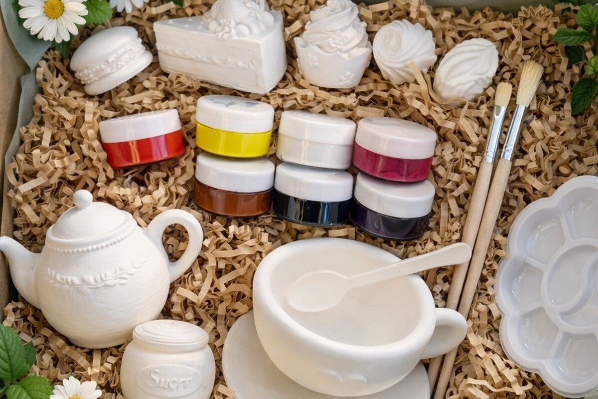 Une sélection de peintures, feutres et accessoires adaptés aux figurines en plâtre, pour un rendu joli, simple et accessible à tous.