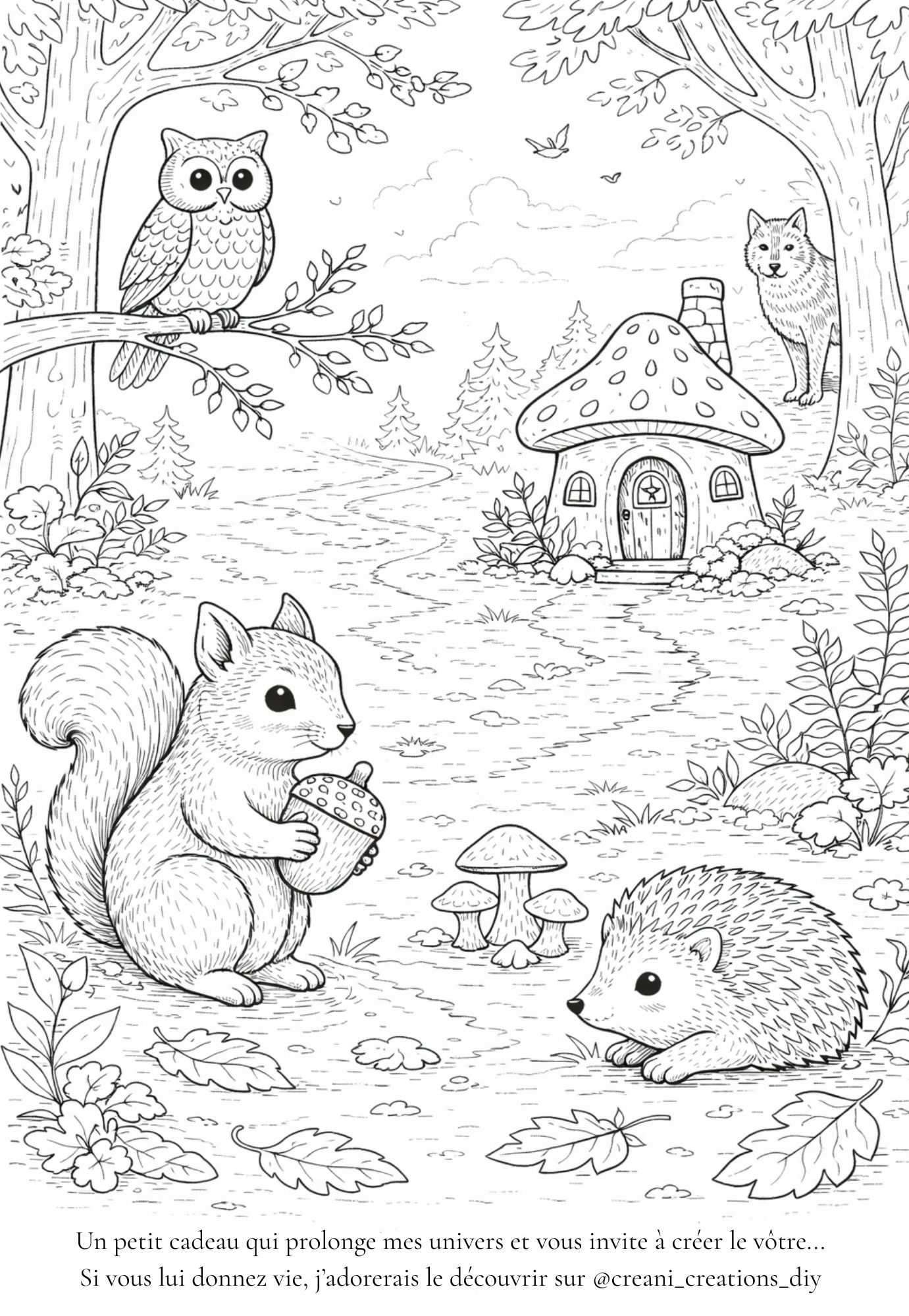 Découvrez un coloriage nature à imprimer inspiré de la vie sauvage en forêt. Dans cette scène apaisante, écureuil, hérissons, loup et hibou évoluent au cœur d’un décor végétal riche et harmonieux. Ce coloriage à imprimer met en avant un univers naturel et doux, parfait pour les amoureux des animaux et des ambiances forestières. Une activité créative idéale pour se détendre, créer et profiter d’un moment calme en famille ou seul, tout en explorant les couleurs de la nature.