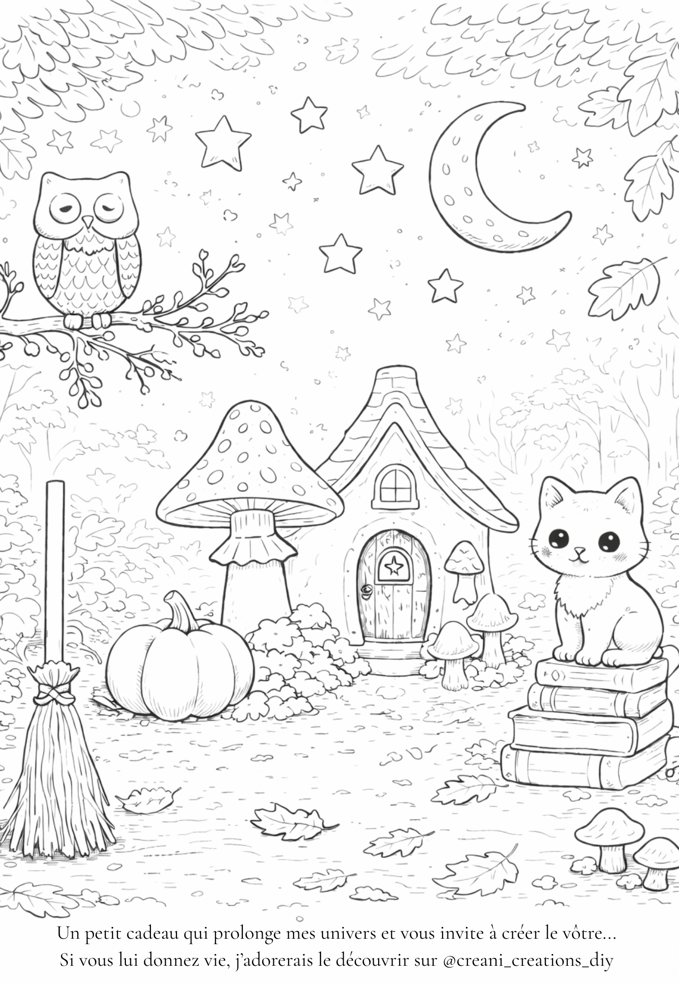Plongez dans une ambiance nocturne douce et mystérieuse avec ce coloriage d’automne à imprimer. Un petit chat veille au milieu des citrouilles, des champignons et d’une maison nichée dans la forêt, créant une scène pleine de charme et de magie. Inspiré des univers d’Halloween doux et poétiques, ce coloriage à télécharger est parfait pour une activité créative autour de l’automne. Il séduira petits et grands avec son atmosphère chaleureuse, entre sortilèges, nature et imagination.