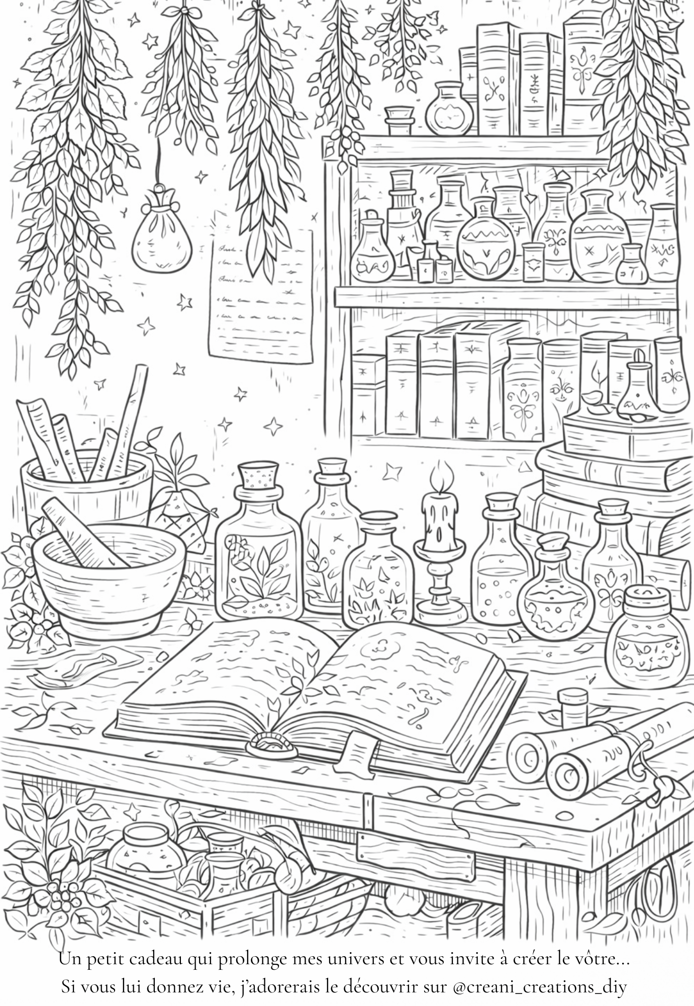 Plongez dans l’univers mystérieux de l’atelier secret de l'apothiquaire, un lieu ancien niché à l’orée de la forêt, rempli de potions, de grimoires et de plantes séchées. Ce coloriage à imprimer invite à explorer un univers magique inspiré des apothicaires d’autrefois, entre recettes oubliées et objets enchantés. Idéal pour un moment créatif calme, ce dessin à colorier séduira autant les enfants que les adultes en quête d’un instant hors du temps, dans une ambiance douce et féerique.