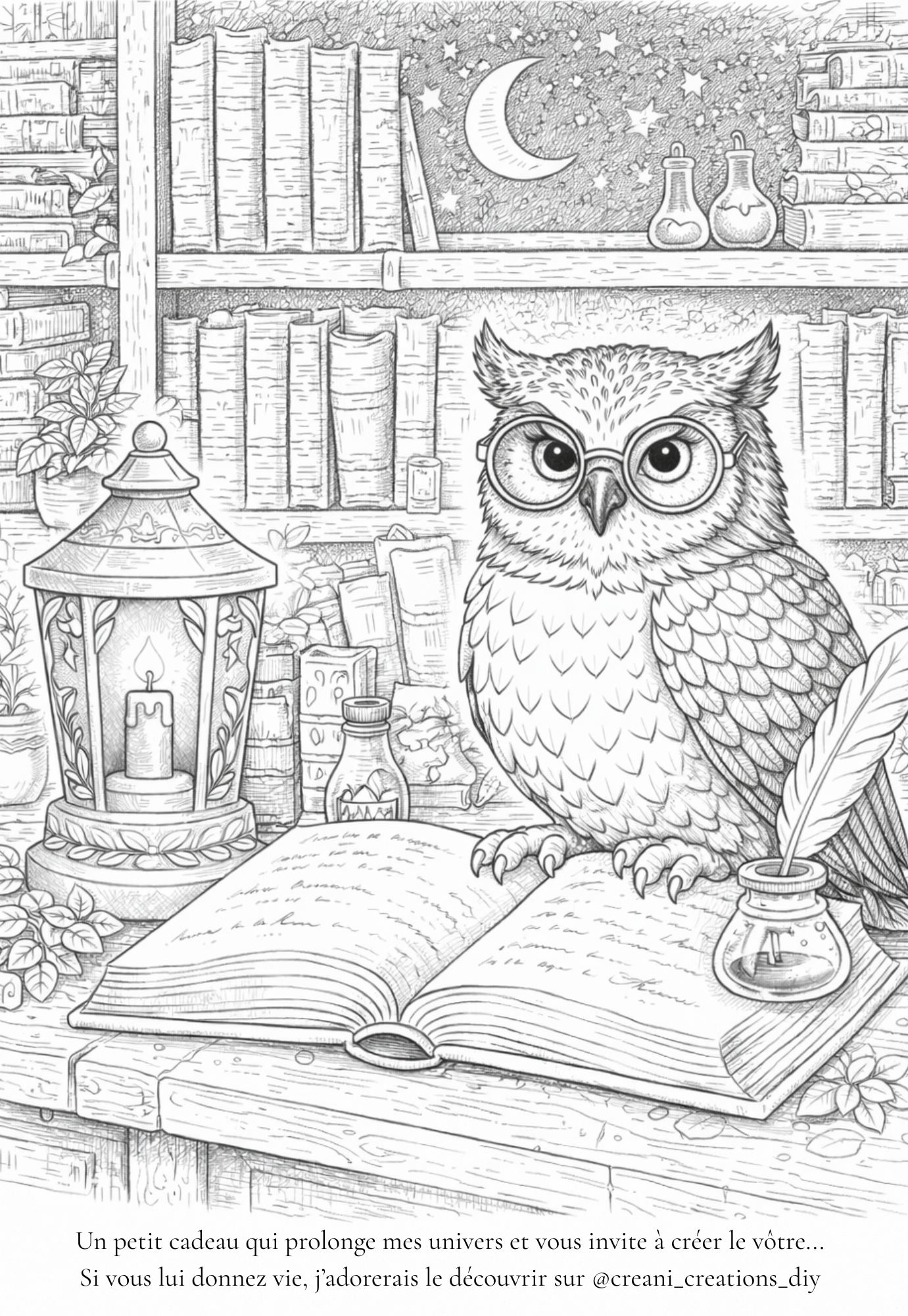 Plongez dans un univers nocturne doux et apaisant avec ce coloriage à imprimer, inspiré d’un gardien des rêves et des histoires… À la tombée du soir, quand tout ralentit et que la lumière devient douce, un hibou veille en silence. Installé au cœur de ses livres, il ne fait pas que lire : il prolonge les histoires, les transforme et les réinvente. Sa lanterne éclaire bien plus que ses pages… elle veille comme une petite lumière rassurante dans la nuit. Autour de lui, les étoiles brillent doucement, comme des souvenirs précieux qui ne s’éteignent jamais. Et chaque soir, avant que la nuit ne s’endorme, il ajoute une nouvelle histoire à son livre… Peut-être la tienne.