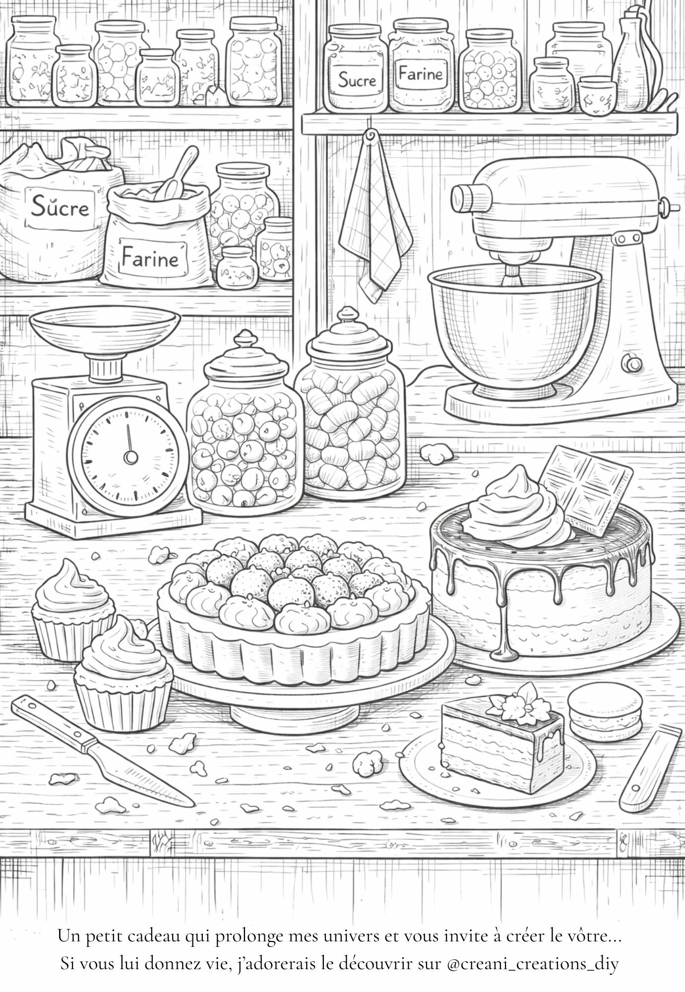 Entrez dans l’univers délicat d’une ancienne pâtisserie à travers ce coloriage gourmand à imprimer. Gâteaux, bonbons, ustensiles et petits détails sucrés composent une scène riche et inspirante, idéale pour stimuler la créativité. Ce coloriage à télécharger est parfait pour les amateurs de cuisine, de pâtisserie et d’univers gourmands. Une activité créative à partager en famille ou à savourer seul, pour un moment de détente sucré et plein de douceur.