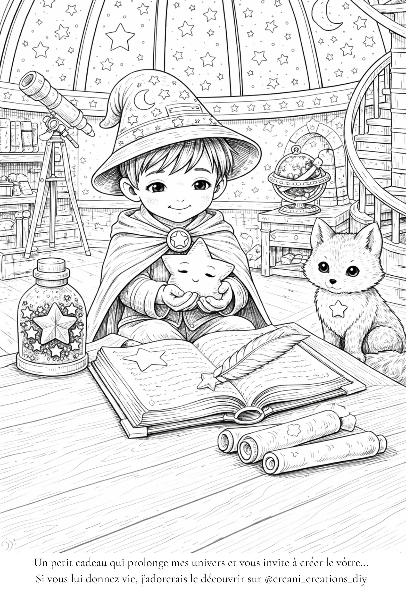 Plongez dans un univers nocturne rempli de douceur avec ce coloriage à imprimer inspiré d’un jeune rêveur, de son renard stellaire et de son observatoire. Entouré de parchemins, d’un astrolabe et de ses instruments d’observation, il découvre une étoile tombée du ciel, comme un secret à protéger. Ce coloriage invite à explorer un monde entre ciel et imagination, où la magie se mêle à la curiosité. Idéal pour un moment créatif apaisant, il séduira les enfants comme les adultes en quête d’évasion, dans une ambiance douce, poétique et légèrement mystérieuse.